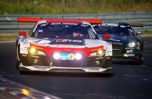The No. 4 Phoenix Racing Audi R8 LMS ultra is the leader at the seven mark at the Nürburgring 24, following a two-way battle with the No. 26 BMW Sports Trophy Team Marc VDS BMW Z4 GT3, which has also led through the dusk-to-nighttime hours.