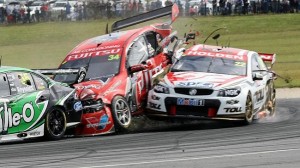 Courtney’s HRT Commodore was impacted heavily on the driver’s side by Alex Premat’s car, which had left the circuit at high speed due to a tyre puncture. Premat assisted Courtney from his car.