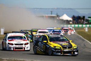 Starting the opening 53-lap race from pole position McLaughlin survived a dramatic start to emerge from the first corner melee to lead narrowly in the Auto Trade Direct Holden V8ST.